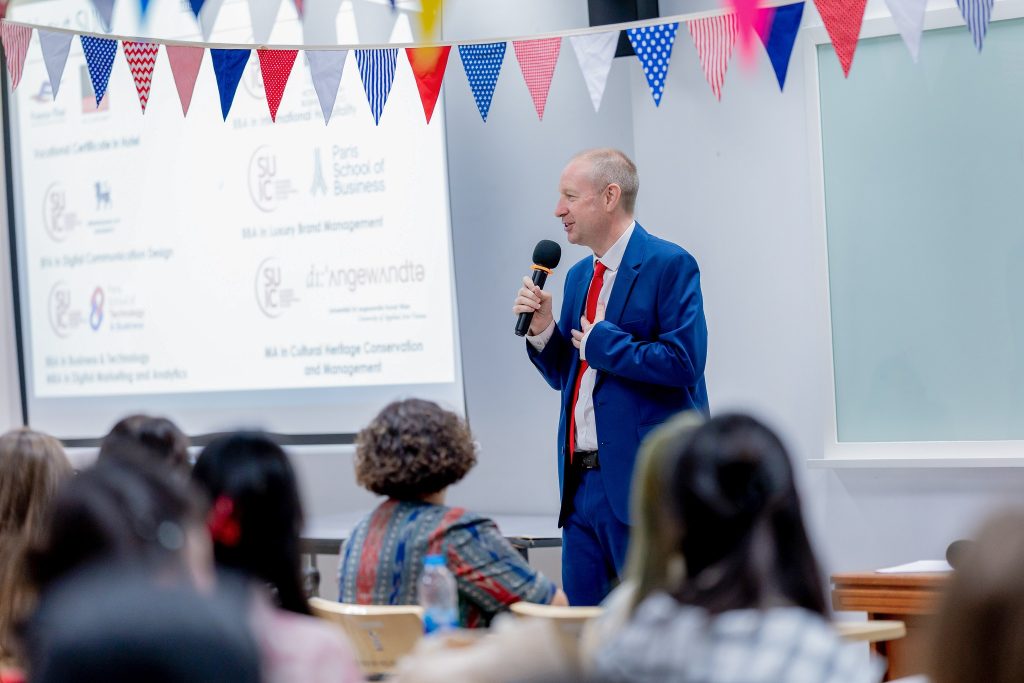 วิทยาลัยนานาชาติ มหาวิทยาลัยศิลปากร จัดโครงการ SUIC’s 7th International Summer School 2025 ระหว่างวันที่ 3-11 สิงหาคม 2568 ณ อาคาร กสท. โทรคมนาคม จำกัด เขตบางรัก กรุงเทพมหานคร โดยมีวัตถุประสงค์เพื่อให้นักศึกษาต่างชาติจากหลายประเทศได้รับความรู้ด้านวัฒนธรรมไทยและเสริมสร้างประสบการณ์นานาชาติ นักศึกษาที่เข้าร่วมโครงการได้ลงทะเบียนในรายวิชา 900 138 The Essence of Thainess ซึ่งหนึ่งในหัวข้อสำคัญของรายวิชานี้ครอบคลุมเนื้อหาเกี่ยวกับอาหารไทยและการจัดการธุรกิจอาหารและเครื่องดื่ม เพื่อให้นักศึกษาได้เรียนรู้ History of Thai Cuisine โดยมุ่งเน้นให้ผู้เข้าร่วมเข้าใจประวัติศาสตร์ อัตลักษณ์ และความสำคัญของอาหารไทยในบริบททางวัฒนธรรม ตลอดจนแนวทางการบริหารจัดการธุรกิจอาหารและเครื่องดื่มอย่างรอบด้าน