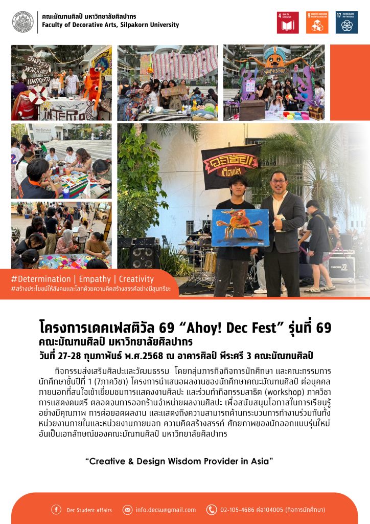 โครงการเดคเฟสติวัล 69 “Ahoy! Dec Fest” รุ่นที่ 69 จัดโดย กลุ่มภารกิจกิจการนักศึกษา ร่วมกับ คณะกรรมการนักศึกษาชั้นปีที่ 1 จากทั้ง 7 ภาควิชา ภายใต้คณะมัณฑนศิลป์ มหาวิทยาลัยศิลปากร ระหว่างวันที่ 27-28 ก.พ. 68 เวลา 16.30 – 21.00 น. ณ อาคารศิลป์ พีระศรี 3 คณะมัณฑนศิลป์ มหาวิทยาลัยศิลปากร วิทยาเขตพระราชวังสนามจันทร์