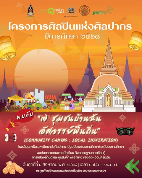 เมื่อวันที่ 8 สิงหาคม 2568 โรงเรียนสาธิตมหาวิทยาลัยศิลปากร (ปฐมวัยและประถมศึกษา) ระดับประถมศึกษา จัดโครงการ “ศิลปินแห่งศิลปากร” ปีการศึกษา 2568 ภายใต้แนวคิด “7 ชุมชนบ้านฉัน อัศจรรย์