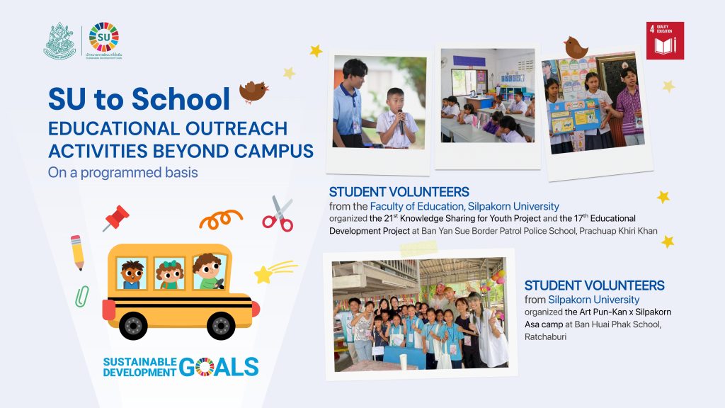 มหาวิทยาลัยศิลปากรในฐานะสถาบันการศึกษา เชื่อมั่นว่า โอกาสทางการศึกษาเป็นรากฐานของการเปลี่ยนแปลงที่ยั่งยืน ด้วยความตั้งใจในการส่งเสริมความเสมอภาคและการเข้าถึงการเรียนรู้ที่มีคุณภาพ ตามเป้าหมายการพัฒนาที่ยั่งยืนแห่งสหประชาชาติ หรือ United Nations’ Sustainable Development Goals (SDGs) มหาวิทยาลัยจึงดำเนินโครงการและกิจกรรมเผยแพร่ความรู้ทางการศึกษานอกมหาวิทยาลัยอย่างต่อเนื่อง ผ่านพลังของนักศึกษาอาสาสมัคร ผู้เป็นฟันเฟืองเล็ก ๆ ที่ขับเคลื่อนการเปลี่ยนแปลงในพื้นที่จริง