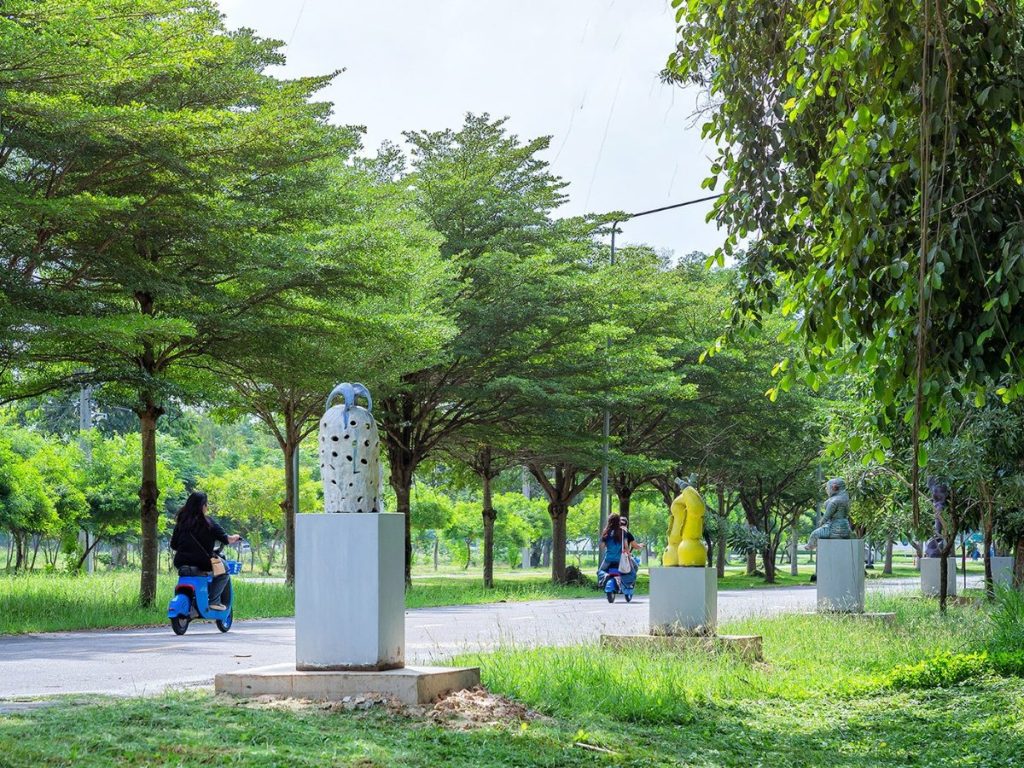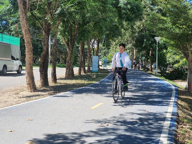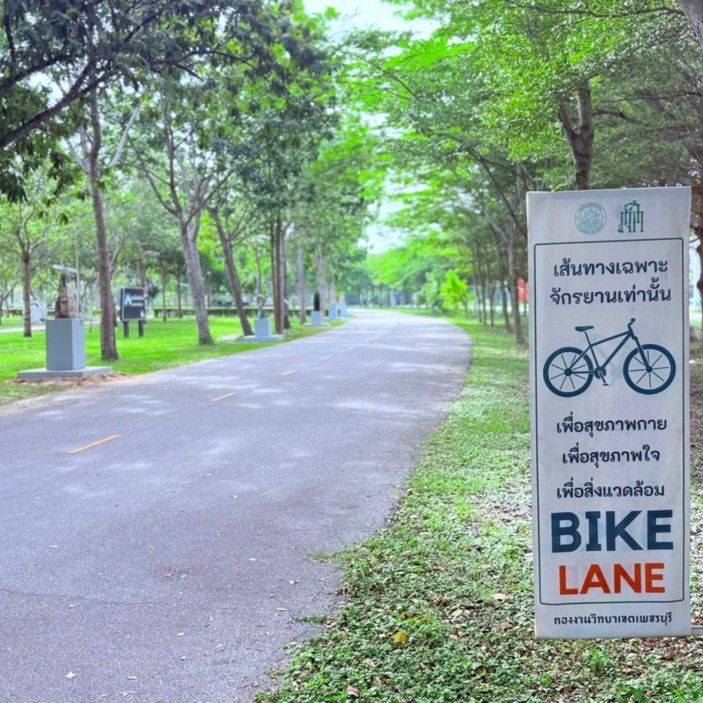 ผ่านการจัดพื้นที่จอดจักรยานและเส้นทางปลอดภัยสำหรับผู้ขับขี่จักรยาน บนถนนประติมากรรม โดยมหาวิทยาลัยศิลปากร วิทยาเขตสารสนเทศเพชรบุรี ได้จัดเตรียมไว้รองรับการปั่นจักรยานและการใช้จักรยานไฟฟ้า เส้นทางถนนประติมากรรมแห่งนี้ จึงถือได้ว่าเป็นการช่วยลดการปล่อยก๊าซเรือนกระจก และส่งเสริมการสัญจรอย่างยั่งยืนอย่างเป็นรูปธรรม เพราะหากวันนี้เราไม่เริ่ม “พรุ่งนี้ก็สายเสียแล้ว”