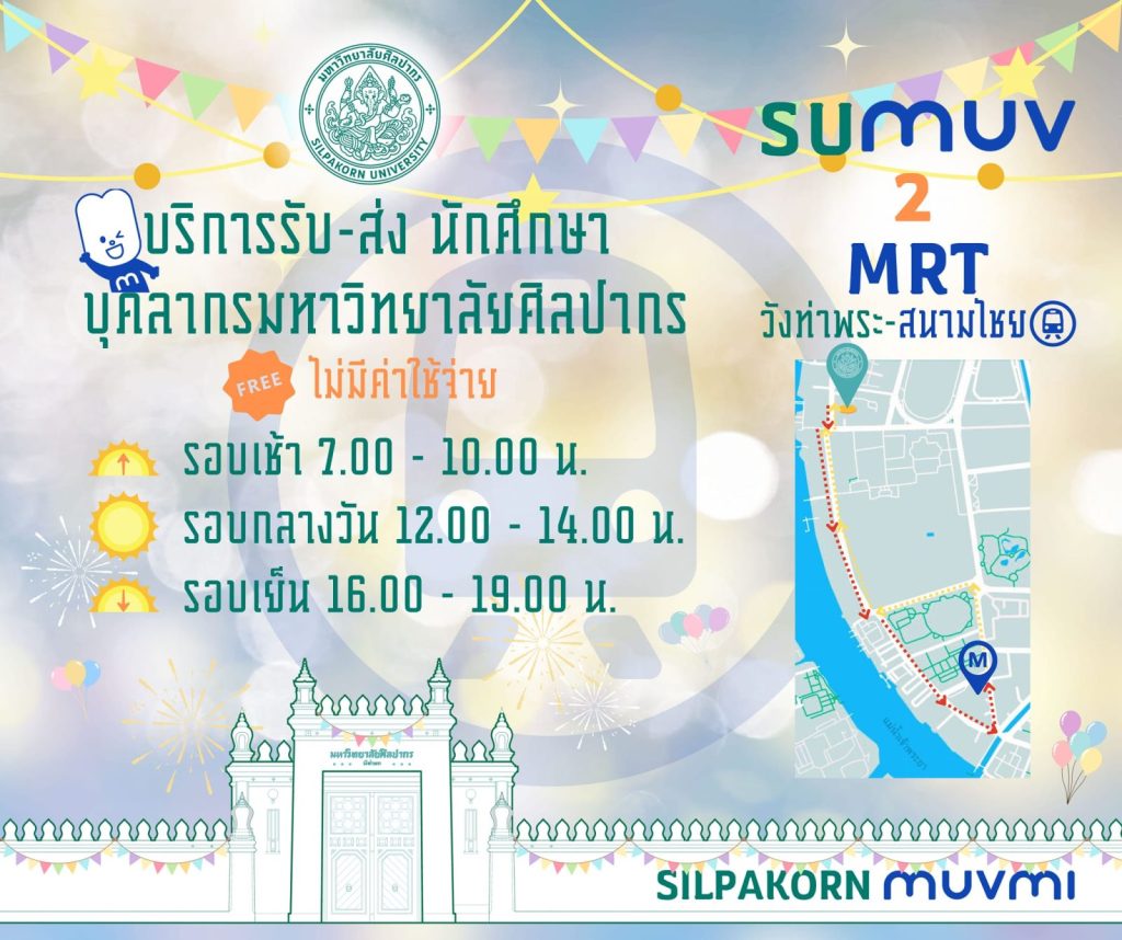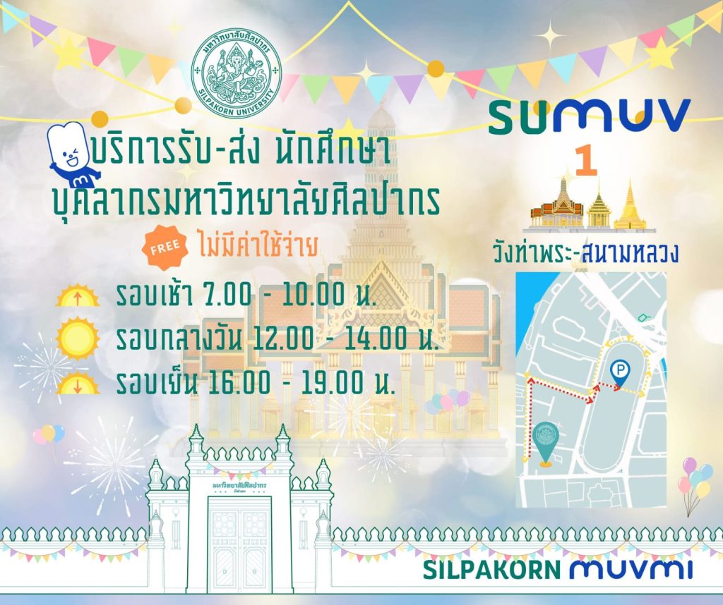 อย่างไรก็ตาม มหาวิทยาลัยศิลปากรไม่เพียงแต่ให้ความสำคัญกับการพัฒนาระบบขนส่งภายในมหาวิทยาลัย แต่เล็งเห็นถึงความรับผิดชอบต่อสังคม เพื่ออำนวยความสะดวกให้กับนักศึกษาและบุคลากรในการเดินทางรอบพื้นที่มหาวิทยาลัย สะดวก รวดเร็ว ปลอดภัย และเป็นมิตรกับสิ่งแวดล้อม มหาวิทยาลัยศิลปากร ร่วมกับ ผู้ให้บริการระบบขนส่งพลังงานสะอาด ให้บริการรถตุ๊กตุ๊กพลังงานไฟฟ้า ภายใต้กิจกรรม SUMUV (SU x MoveMi) เพื่อส่งเสริมการเดินทางด้วยรถโดยสารสาธารณะ และสร้างพฤติกรรมการเดินทางที่เป็นมิตรกับสิ่งแวดล้อม โดยเปิดให้บริการ 2 เส้นทางหลัก ได้แก่