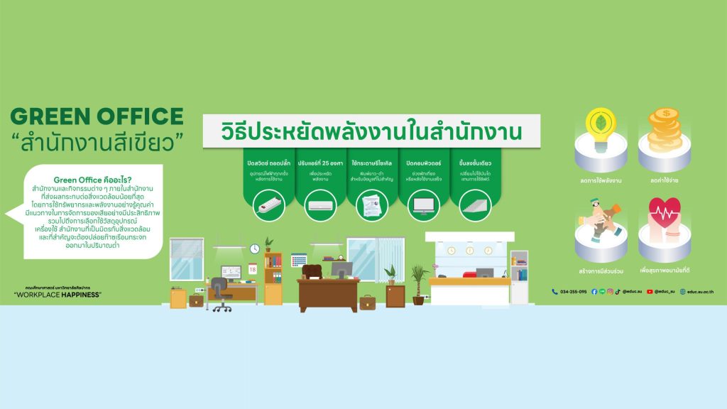 ให้เป็นแบบประหยัดพลังงาน เช่น เครื่องปรับอากาศระบบอินเวอร์เตอร์ คอมพิวเตอร์ ตู้เย็น เครื่องถ่ายเอกสาร และเครื่องใช้สำนักงานอื่น ๆ โดยเลือกใช้รุ่นที่ได้รับฉลากประหยัดไฟฟ้าเบอร์ 5 หรือเทียบเท่ามาตรฐานสากล เพื่อเพิ่มประสิทธิภาพการใช้พลังงานและลดการปล่อยก๊าซคาร์บอนไดออกไซด์