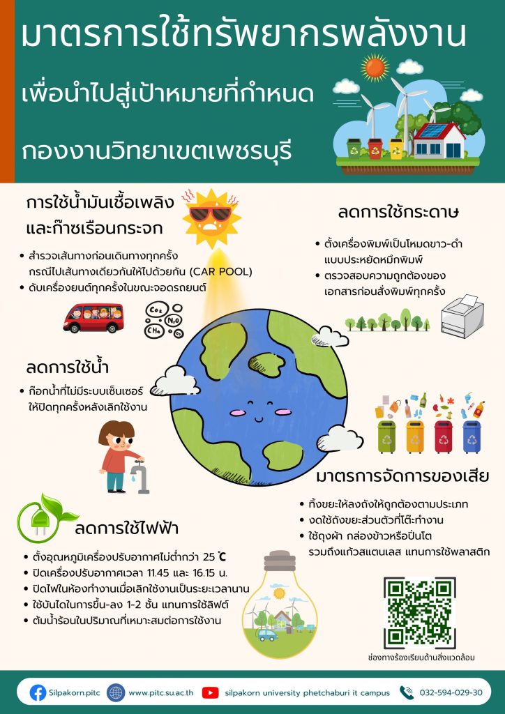 มหาวิทยาลัยศิลปากรตระหนักถึงความสำคัญของการอนุรักษ์พลังงานและการใช้พลังงานอย่างมีประสิทธิภาพ เพื่อสนับสนุนแนวทางการพัฒนาอย่างยั่งยืนและลดผลกระทบต่อสิ่งแวดล้อมจากการใช้พลังงานฟอสซิล โดยได้ดำเนินการปรับปรุงและเปลี่ยนแปลงอุปกรณ์เครื่องใช้ไฟฟ้า และระบบสาธารณูปโภคภายในมหาวิทยาลัยให้มีประสิทธิภาพด้านพลังงานสูงขึ้นอย่างต่อเนื่อง ดังนี้