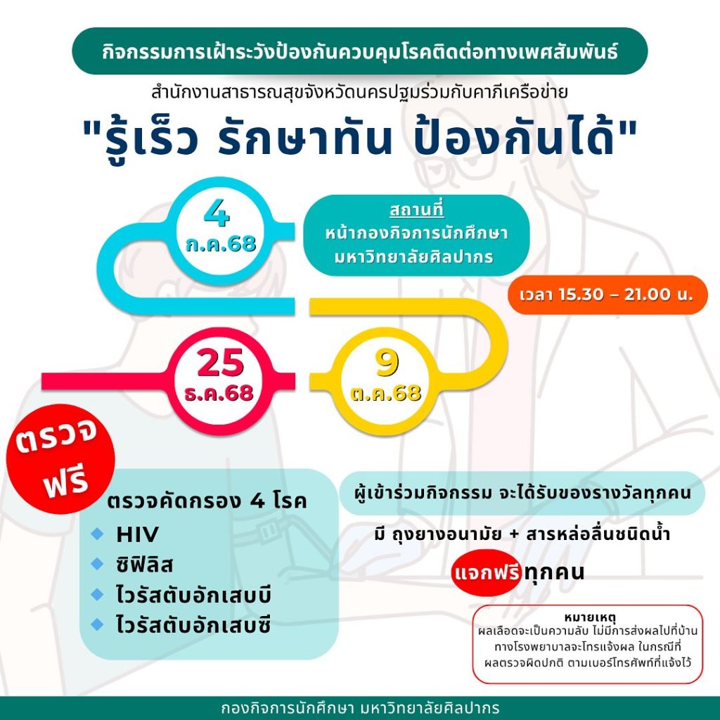 เมื่อวันที่ 24 กรกฎาคม 2568 กองกิจการนักศึกษา มหาวิทยาลัยศิลปากร ร่วมกับโรงพยาบาลนครปฐมและสำนักงานหลักประกันสุขภาพแห่งชาติ จัดกิจกรรมฉีดวัคซีนป้องกันมะเร็งปากมดลูก (HPV) ฟรี ให้กับนักศึกษาหญิง