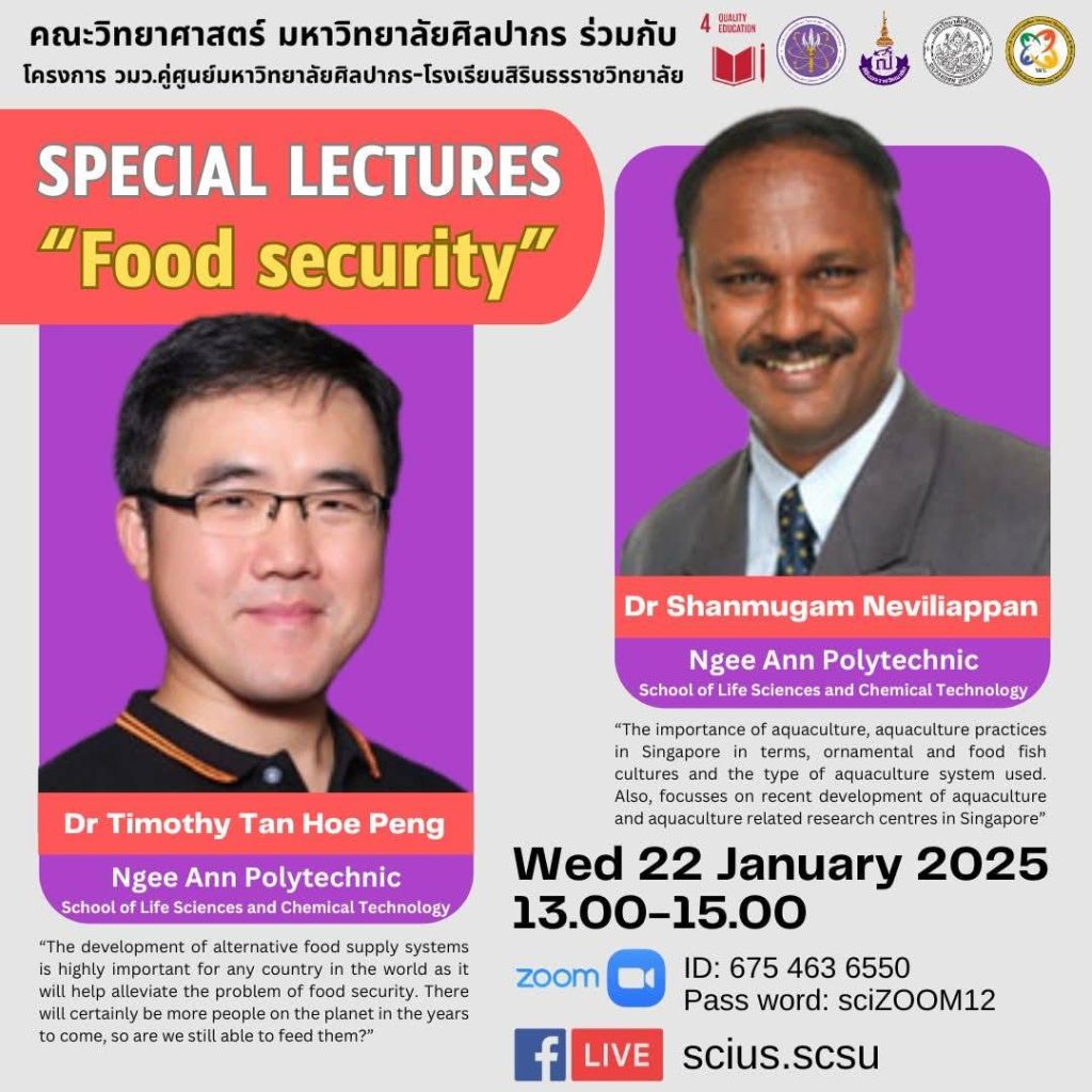 เมื่อวันที่ 22 มกราคม 2568 คณะวิทยาศาสตร์ มหาวิทยาลัยศิลปากร ร่วมกับโครงการห้องเรียนวิทยาศาสตร์ในโรงเรียน ภายใต้การกำกับดูแลของมหาวิทยาลัย (วมว.) คู่ศูนย์มหาวิทยาลัยศิลปากร–โรงเรียนสิรินธรราชวิทยาลัย จัดการสัมมนา เรื่อง “Food Security”