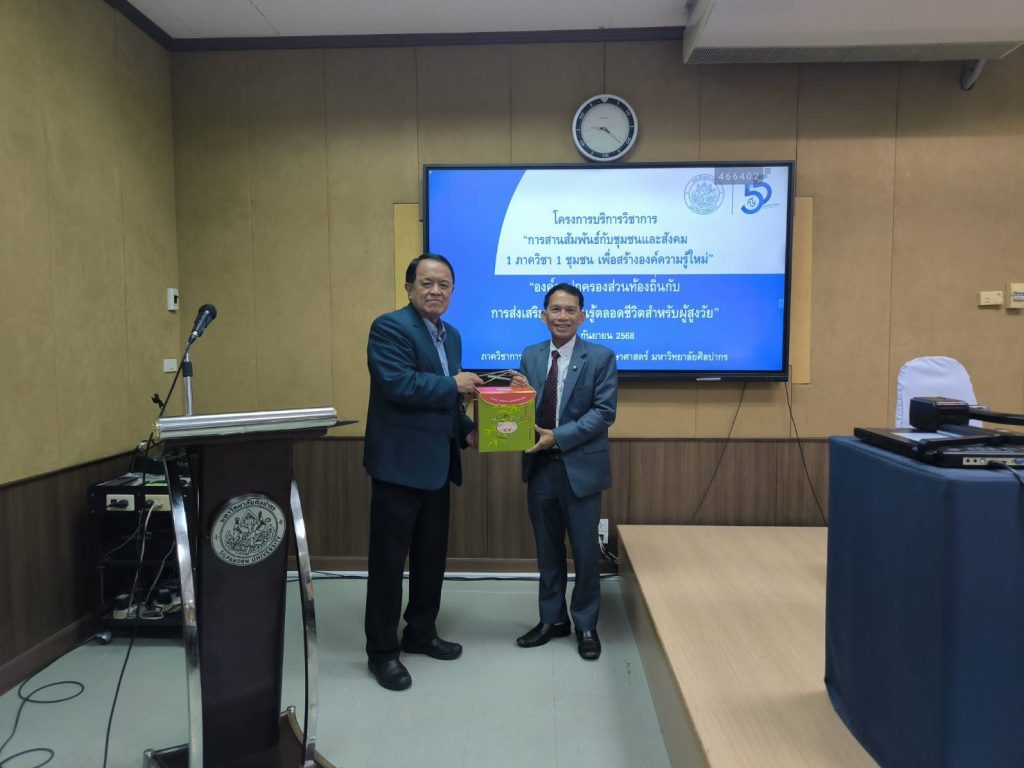 เมื่อวันที่ 5 กันยายน 2568 ภาควิชาการศึกษาตลอดชีวิต คณะศึกษาศาสตร์ มหาวิทยาลัยศิลปากร จัดโครงการบริการวิชาการ “การสานสัมพันธ์กับชุมชนและสังคม 1 ภาควิชา 1 ชุมชน  เพื่อสร้างองค์ความรู้ใหม่ (Social Engagement)” ภายใต้หัวข้อ เรื่อง “องค์กรปกครองส่วนท้องถิ่นกับการส่งเสริมการเรียนรู้ตลอดชีวิตสำหรับผู้สูงวัย”