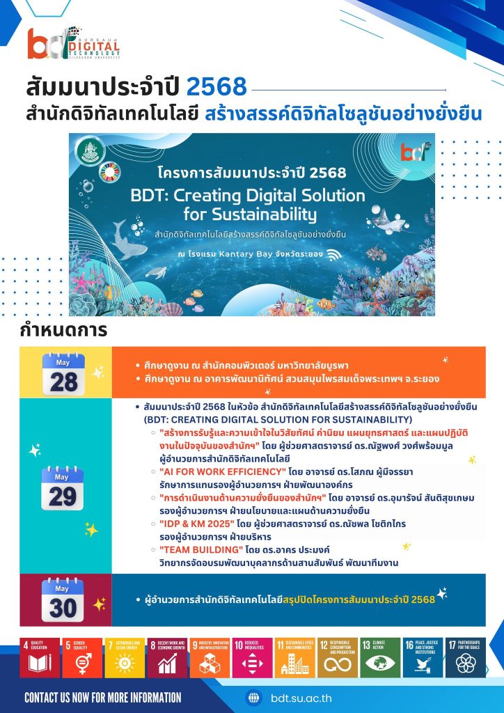 สำนักดิจิทัลเทคโนโลยี มหาวิทยาลัยศิลปากร ได้ดำเนินจัดโครงการสัมมนาประจำปี 2568 ภายใต้หัวข้อ “สำนักดิจิทัลเทคโนโลยีสร้างสรรค์ดิจิทัลโซลูชันอย่างยั่งยืน (BDT: Creating Digital Solution for Sustainability)” จัดขึ้นระหว่างวันที่ 28-30 พฤษภาคม 2568