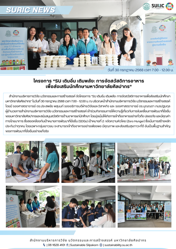 สำนักงานบริหารการวิจัย นวัตกรรมและการสร้างสรรค์ จัดโครงการ “SU เติมอิ่ม เติมพลัง: การจัดสวัสดิการอาหารเพื่อส่งเสริมนักศึกษา มหาวิทยาลัยศิลปากร” ในวันที่ 30 กรกฎาคม 2568 เวลา 7.00 – 12.00 น. ณ บริเวณหน้าสำนักงานบริหารการวิจัย นวัตกรรมและการสร้างสรรค์ โดยมี รองศาสตราจารย์ ดร.ประสพชัย พสุนนท์ รองอธิการบดีฝ่ายวิจัยและวิสาหกิจ และ รองศาสตราจารย์ ดร.บุณณดา ภมรปฐมกุล ผู้อำนวยการสำนักงานบริหารการวิจัย นวัตกรรมและการสร้างสรรค์ เข้าร่วมกิจกรรมการให้ความรู้เกี่ยวกับการขับเคลื่อนการพัฒนาที่ยั่งยืน ของมหาวิทยาลัยศิลปากรและสนับสนุนสวัสดิการด้านอาหารแก่นักศึกษา โดยมุ่งเน้นให้เกิดการเข้าถึงอาหารอย่างทั่วถึง ปลอดภัย และมีคุณค่าทางโภชนาการ ซึ่งสอดคล้องกับเป้าหมายการพัฒนาที่ยั่งยืน (SDGs) เป้าหมายที่ 2: ขจัดความหิวโหย (Zero Hunger) ซึ่งเน้นการสร้างหลักประกันว่าทุกคน โดยเฉพาะกลุ่มเยาวชน จะสามารถเข้าถึงอาหารอย่างเพียงพอ มีคุณภาพ และส่งเสริมสุขภาวะที่ดี อันเป็นพื้นฐานสำคัญของการพัฒนาที่ยั่งยืนอย่างแท้จริง