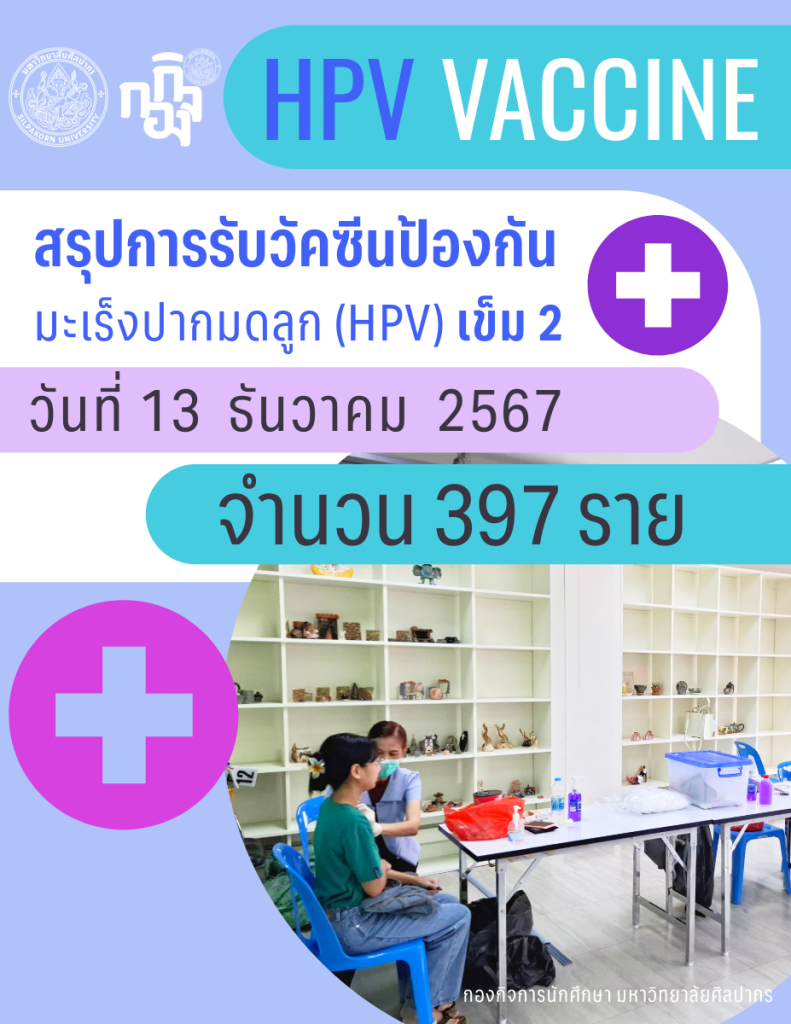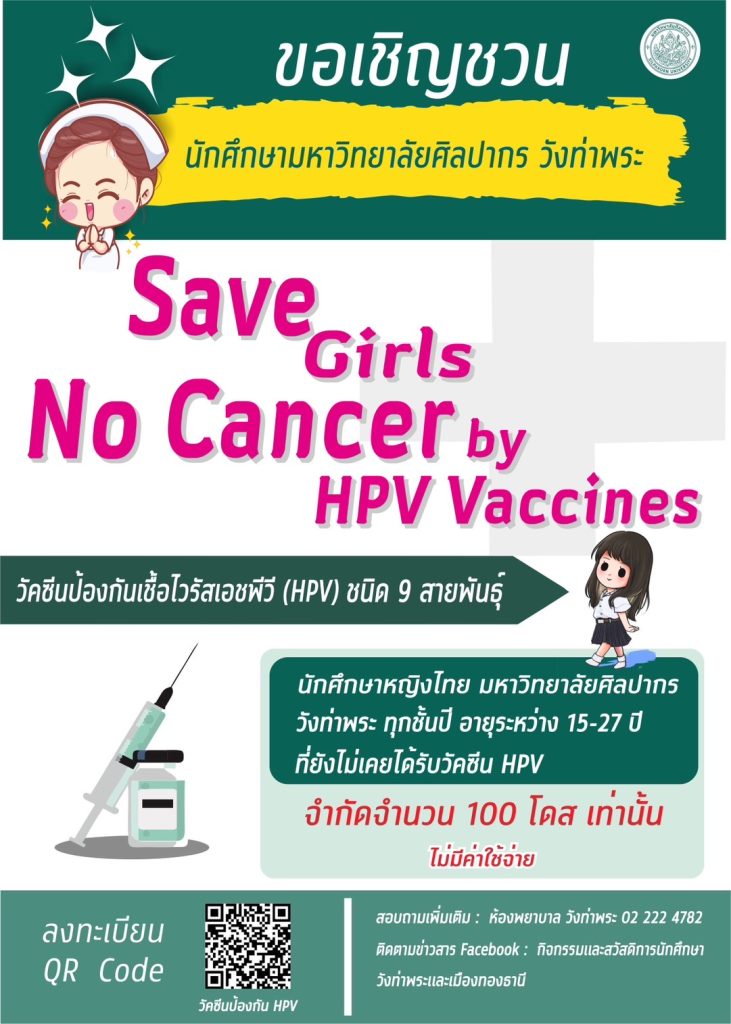 กิจกรรมบริการสุขภาวะทางเพศ ฉีดวัคซีนป้องกันเชื้อไวรัส HPV ชนิด 9 สายพันธุ์ จัดขึ้นโดยมีวัตถุประสงค์ในการเสริมสร้างภูมิคุ้มกันในระยะยาว ลดความเสี่ยงของการเกิดมะเร็งปากมดลูก และโรคร้ายแรงอื่น ๆ ให้กับนักศึกษาหญิง โดยไม่เสียค่าใช้จ่าย วัคซีนชนิดนี้ครอบคลุมสายพันธุ์ของเชื้อไวรัสที่เป็นสาเหตุของโรคร้ายแรงหลายชนิด อาทิ มะเร็งปากมดลูก มะเร็งช่องคลอด มะเร็งทวารหนัก มะเร็งช่องปากและลำคอ และหูดหงอนไก่ นักศึกษาหญิงมหาวิทยาลัยศิลปากรสามารถเข้ารับบริการได้ทุกวิทยาเขต