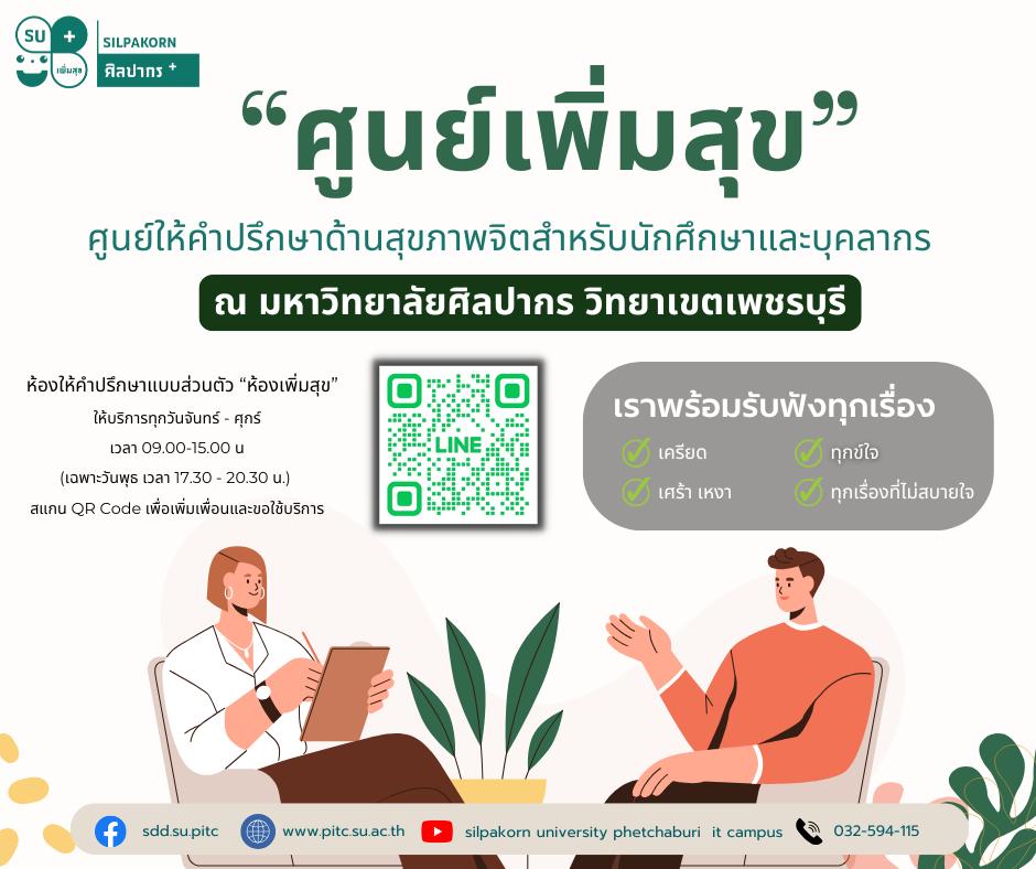 มหาวิทยาลัยศิลปากร วิทยาเขตเพชรบุรี ได้จัดตั้ง “ศูนย์เพิ่มสุข” ขึ้น เพื่อเป็นพื้นที่แห่งการรับฟัง เข้าใจ และดูแลจิตใจของนักศึกษา คณาจารย์ และบุคลากรทุกคนอย่างรอบด้าน จิตใจที่มั่นคงและเป็นสุข ความคิดสร้างสรรค์ย่อมเบ่งบาน การเรียนรู้เป็นไปอย่างมีคุณภาพ และบรรยากาศในมหาวิทยาลัยก็จะเปี่ยมด้วยความร่วมมือ ความเข้าใจ และพลังบวก ล้วนเป็นรากฐานสำคัญที่ผลักดันให้มหาวิทยาลัยศิลปากรเติบโตอย่างยั่งยืน เป็นพื้นที่แห่งการพัฒนาทั้งทางวิชาการและทางจิตใจ