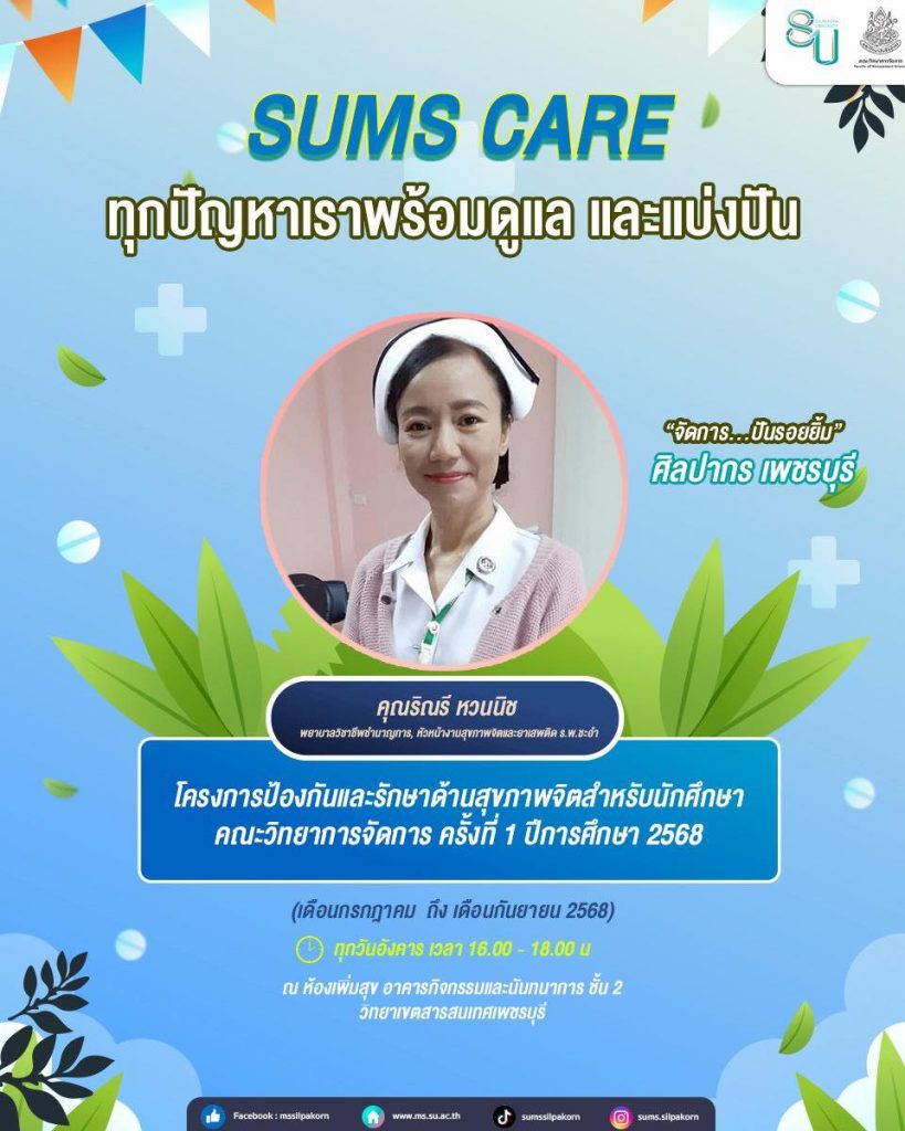 ด้วยบริบทสังคมปัจจุบันที่เปลี่ยนแปลงอย่างรวดเร็ว “สุขภาพจิต” จึงเป็นปัจจัยพื้นฐานที่ไม่อาจมองข้าม มหาวิทยาลัยศิลปากรตระหนักถึงความสำคัญของการมีคุณภาพชีวิตที่ดีรอบด้านในมิติของบุคคล เงื่อนไขเฉพาะของความเปราะบาง และความสามารถในการฟื้นกลับที่เป็นผลมาจากความแตกต่างของสังคมแต่ละบุคคล อีกทั้งยังเชื่อมั่นว่าสุขภาพจิตที่มั่นคงเป็นรากฐานของการเรียนรู้ การสร้างสรรค์ และการเติบโตอย่างยั่งยืน มหาวิทยาลัยจึงไม่จำกัดการให้บริการด้านสุขภาพจิตไว้เพียงการรักษา แต่ยังรวมถึงการป้องกัน บรรเทา และลดปัญหาด้านสุขภาพจิต ความเครียด และภาวะซึมเศร้าอย่างครอบคลุมและต่อเนื่อง ผ่านหลากหลายช่องทาง อาทิ