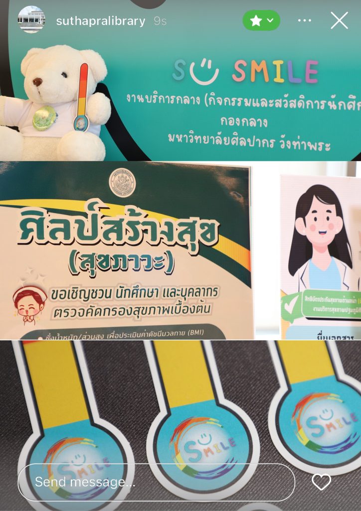 ร่วมดูแลสุขภาพใจไปกับกิจกรรมเพิ่มพลังบวก “เปิดบ้าน เปิดใจ Add yours Health Jai” ภายใต้งาน “You’re Invited to Close Friends สวัสดีคุณเพื่อนสนิท” SU Smile ให้คำปรึกษาสุขภาวะใจ ด้วยเครื่องมือสุดน่ารัก “ปรอทวัดรอยยิ้ม” พร้อมตรวจคัดกรองความเครียดและสุขภาพจิตให้กับนักศึกษา และบุคลากร โดยไม่มีค่าใช้จ่าย ณ หอสมุดวังท่าพระ มหาวิทยาลัยศิลปากร