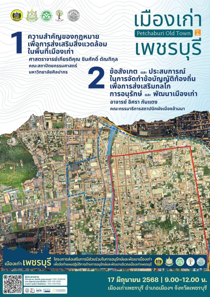 เมื่อวันที่ 17 มิถุนายน พ.ศ. 2568 ศาสตราจารย์เกียรติคุณ ชินศักดิ์ ตัณฑิกุล ผู้ทรงคุณวุฒิประจำคณะสถาปัตยกรรมศาสตร์ มหาวิทยาลัยศิลปากร ได้นำเสนอองค์ความรู้เรื่อง “ความสำคัญของกฎหมายเพื่อการส่งเสริมสิ่งแวดล้อมในพื้นที่เมืองเก่า” พร้อมด้วย อาจารย์อิศรา กันแตง คณะกรรมาธิการสถาปนิกผังเมืองล้านนา ร่วมแลกเปลี่ยนความรู้ในหัวข้อ ข้อสังเกตและประสบการณ์เชิงปฏิบัติในการจัดทำข้อบัญญัติท้องถิ่นเพื่อสนับสนุนกลไกการอนุรักษ์และพัฒนาเมืองเก่า ผ่านการบรรยายพิเศษแก่คณะอนุกรรมการอนุรักษ์และพัฒนาเมืองเก่า องค์กรปกครองส่วนท้องถิ่น บุคลากรสถาบันการศึกษา และผู้สนใจทั่วไป เพื่อเสริมสร้างความเข้าใจในการอนุรักษ์และพัฒนาเมืองเก่าเพชรบุรี