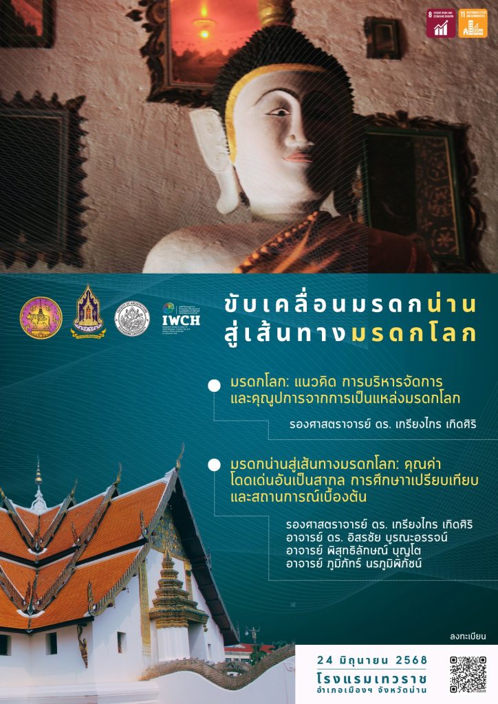 เมื่อวันที่ 24 มิถุนายน 2568 จังหวัดน่าน โดยสำนักงานวัฒนธรรมจังหวัด ร่วมกับ ศูนย์วิจัยบูรณาการด้านมรดกโลก เมืองสร้างสรรค์ ภูมิทัศน์เมืองประวัติศาสตร์ (IWCH) หลักสูตรนานาชาติสาขาวิชาการจัดการมรดกทางสถาปัตยกรรม อุตสาหกรรมสร้างสรรค์ และการท่องเที่ยว ได้กำหนดจัดการบรรยายพิเศษเพื่อสร้างความรู้ความเข้าใจเกี่ยวกับมรดกโลกให้แก่หน่วยงานภาครัฐผู้มีส่วนเกี่ยวข้องในการขับเคลื่อนมรดกวัฒนธรรมจังหวัดน่านสู่มรดกโลก