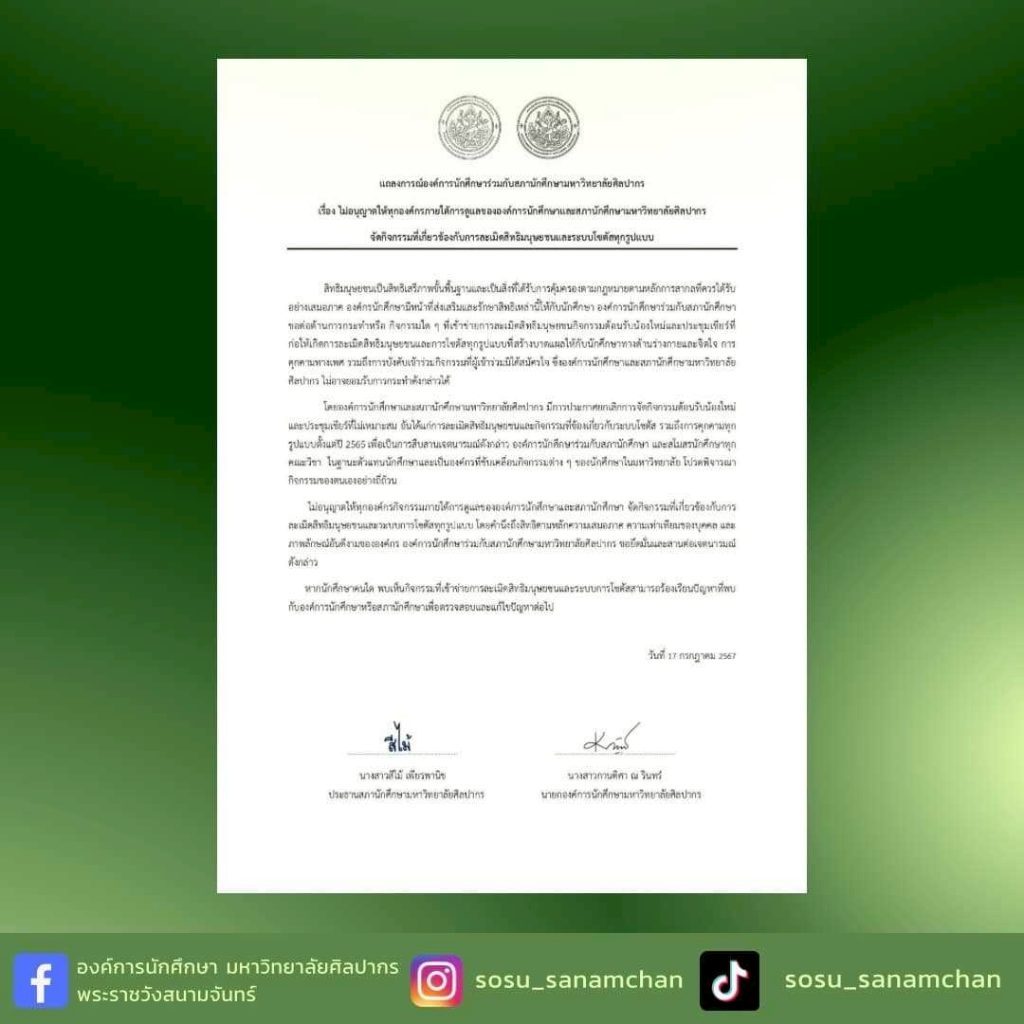 https://www.facebook.com/SOSilpakornU/posts/pfbid0gM9ghCtcTNcHsAkuTqN2dJJGs5BFBq73uowWTwCU2mWar1bqz6Pz1qcYZStQQrmVl