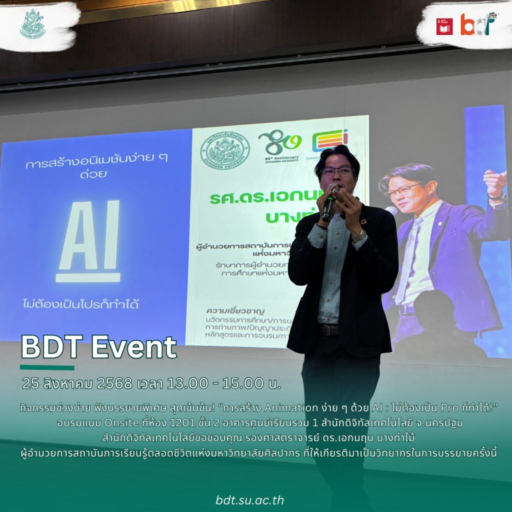 - วันที่ 25 สิงหาคม 2568 หัวข้อ “การสร้าง Animation ง่าย ๆ ด้วย AI: ไม่ต้องเป็น Pro ก็ทำได้!” โดย รองศาสตราจารย์ ดร.เอกนฤน บางท่าไม้