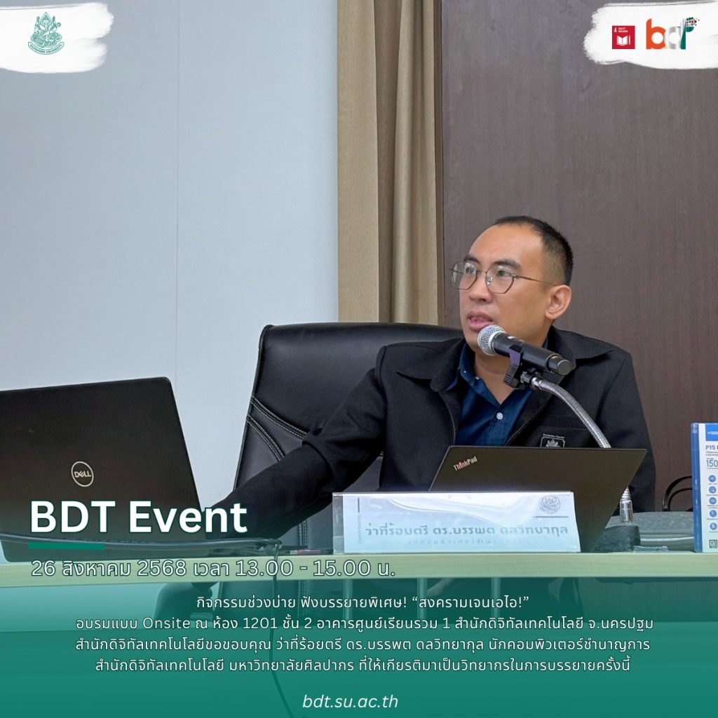 - วันที่ 26 สิงหาคม 2568 หัวข้อ “สงครามเจนเอไอ” โดย ว่าที่ร้อยตรี ดร.บรรพต ดลวิทยากุล
